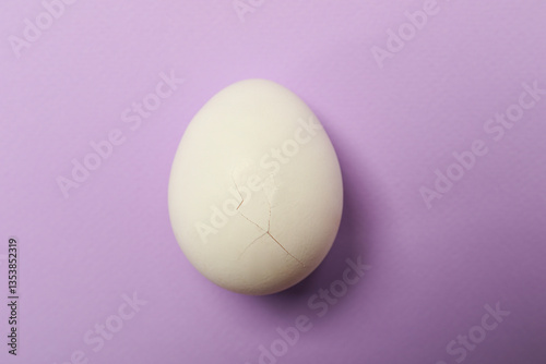 Fototapeta premium One egg with cracked shell on violet background, top view