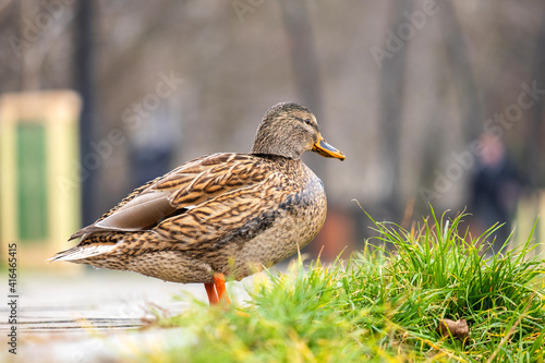 © bilanol, Fototapeta premium One gray wild duck walking in summer park.