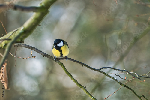 © Bullysoft, Naklejka premium one greathungry great tit in the winter tit on a tree at a cold and sunny winter day