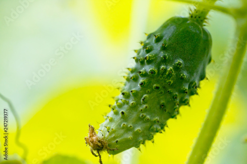 © Maryna, Naklejka premium One green ripe cucumber on a bush among the leaves. Cucumber on the background of the garden.