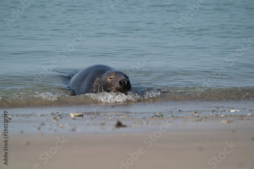 © Dasya - Dasya, Fototapeta premium One Grey Seal, swimming in the sea with head above water. On the beach inside sea waves