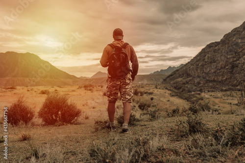 Naklejka premium one hiker men walking in the mountains