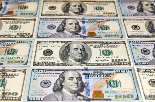 © Baranov, Fototapeta premium One Hundred Dollar Banknotes. Dollars Closeup Concept. American Dollars Cash Money.