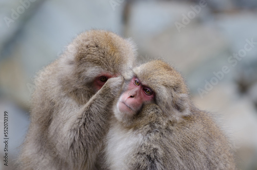© Víctor, Fototapeta premium One Japanese macaque Macaca fuscata grooming another. Jigokudani Monkey Park. Yamanouchi. Nagano Prefecture. Joshinetsu Kogen National Park. Japan.