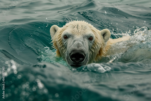 © Balica, Fototapeta premium One large, white, polar bear swims in cold waters of Arctic Ocean, its head visible on surface
