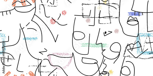 © Сашка Шаргаева, Fototapeta premium One line drawing. Abstract face seamless pattern.