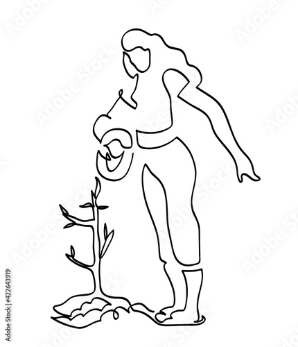 © taylanzgr, Obraz premium One line drawing of woman volunteer pouring water to a tree. One continuous line drawing of woman watering tree.