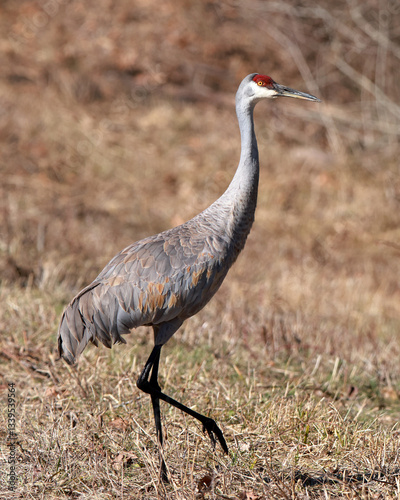 Obraz premium One magnificent Sandhill Crane walking on brown grasses.