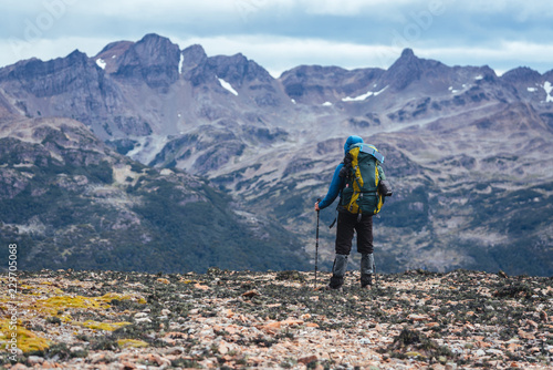 © Alexandr, Fototapeta premium One man backpacker stands in front of mountains of Patagonia
