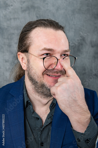 Fototapeta premium One man in a blue jacket adjusts his glasses
