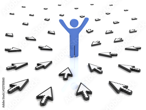 © masterzphotofo, Fototapeta premium One man standing arms wide open with many arrow cursors aiming at him concept isolated over white background with reflection