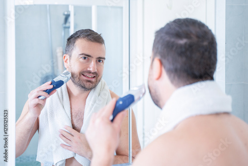 Fototapeta premium One man trimming his beard using electric beard trimmer