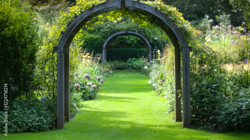 Fototapeta premium One minimalist, clean-lined garden arch, its wood natural against a green...