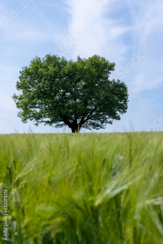 Fototapeta premium one oak with green foliage in the summer field