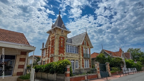 Naklejka premium One of charmante villas in the picturesque resort town Soulac-sur-Mer on the Atlantic, France. Against the background of a blue sky with white clouds.