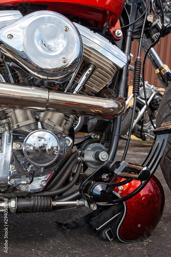 © FotoKachna, Obraz premium One of several motorcycles parked in the city