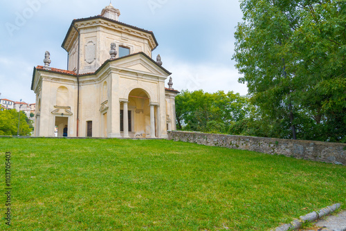 © Travelling Jack, Naklejka premium One of the several chapels located on the walking path of the site named "Sacro Monte" (meaning Sacred Mount), close to the city of Varese, Italy. Green lawn in the foreground.
