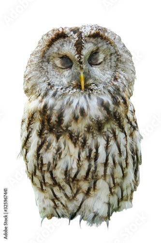 Fototapeta premium One owl with closed eyes, isolated on white backdrop