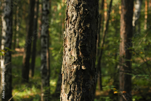 Fototapeta premium One part of the pine trunk and its bark is lit in sunlight close-up, the other is in the shade against the background of a green forest and other trees