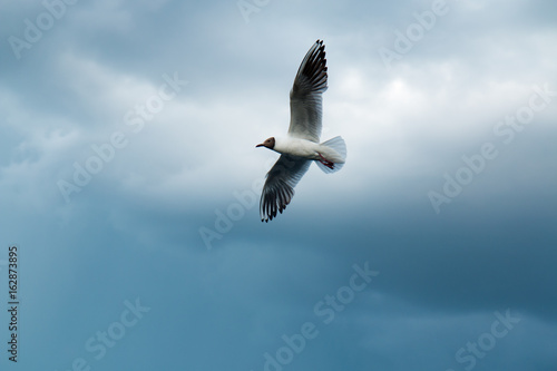 Obraz premium One river gull flies over the lake against a background of thunderclouds in cloudy weather