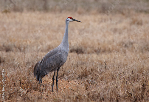 Fototapeta premium One sandhill crane standing in a grassy field