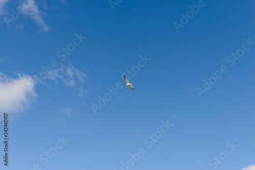 Fototapeta premium One seagull flies in the blue sky with clouds