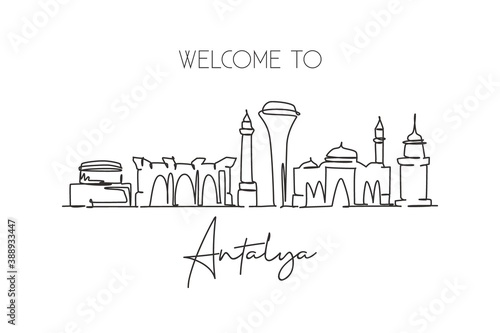 Obraz premium One single line drawing Antalya city skyline, Turkey. World historical town...