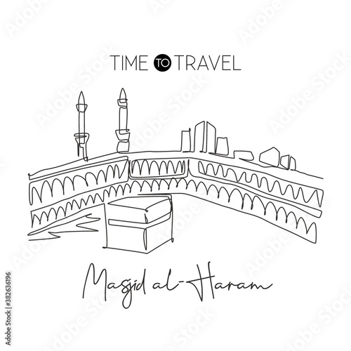 © Simple Line, Fototapeta premium One single line drawing Masjid el Haram landmark. World famous iconic in Mecca, Saudi Arabia. Religious hajj umrah concept wall decor print art. Modern continuous line draw design vector illustration
