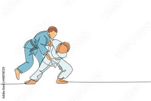 Obraz premium One single line drawing of two young energetic judokas fighter men focus...