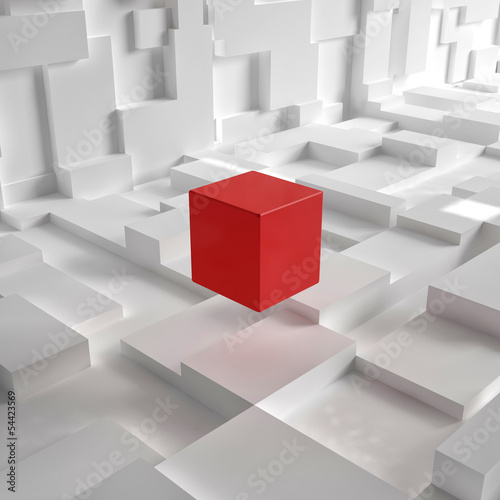 © XtravaganT, Fototapeta premium One single red cube in a modern futuristic white room