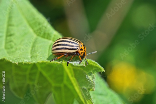 © butus, Fototapeta premium one striped colorado beetle sits on a green leaf of nettle in nature