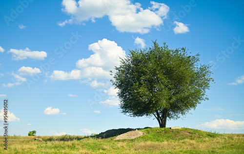 © Olena Vasylieva, Obraz premium one tree growing in a meadow.