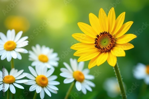 Naklejka premium One vibrant sunflower among plain white daisies, flower, nature