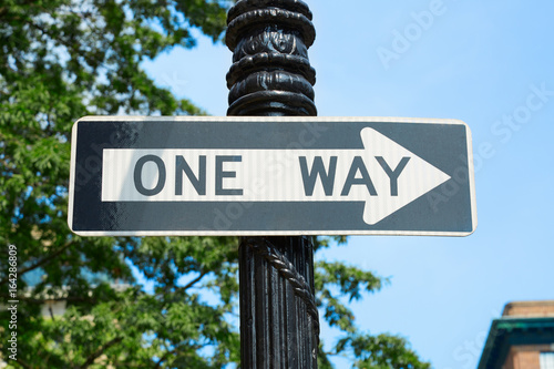 © andersphoto, Fototapeta premium One way street sign in New York with green tree branches and blue sky