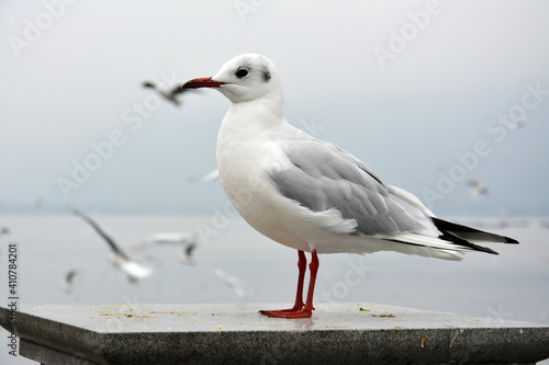 Obraz premium one white larus ridibundus standing still on the platform in cloudy day