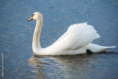 © Aliaksei, Fototapeta premium One white swan on blue water with small waves. Wildlife Background
