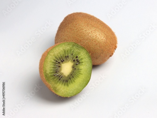 Obraz premium One whole and half kiwi cut. Close-up, light gray background, selective focus.