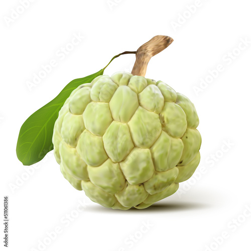 © leezarius, Fototapeta premium One whole cherimoya, annona cherimola, isolated on white background. Raw tropical fruit. Custard apple. Realistic vector 3d illustration