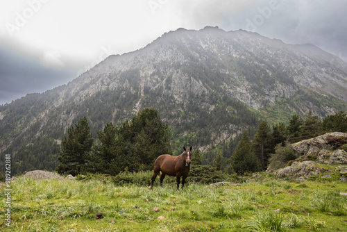 Fototapeta premium One wild horse grazing in the mountains in summer, Andorra