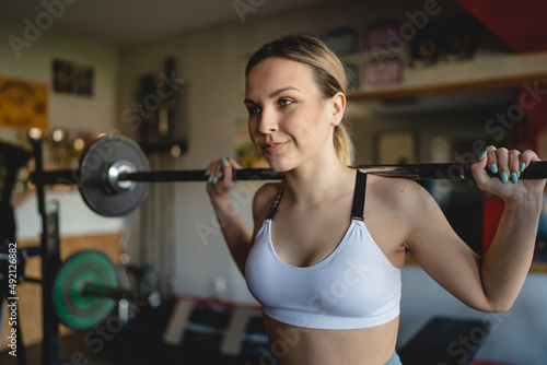 © Miljan Živković, Obraz premium One woman training at gym female athlete doing squats with barbell and weight on her shoulders close up copy space strength and fitness exercise concept