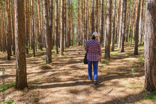 Fototapeta premium One woman walks with a small brown dog in a pine forest. Summer sunny day