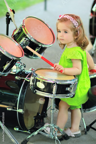 © Free_styler, Fototapeta premium One year old cute girl in a green embroidered romper learning to drum outdoors