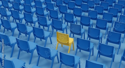 Naklejka premium One yellow chair among many blue chairs showing uniqueness and standing out