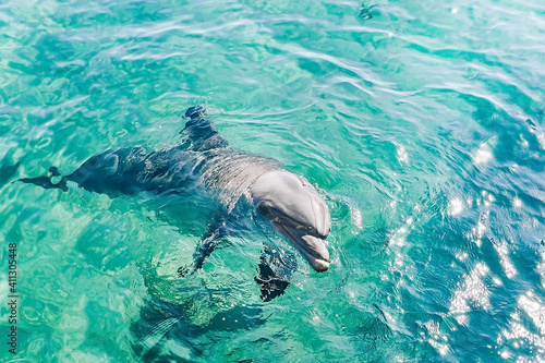 Fototapeta premium one young beautiful dolphin emerges from water, playful animal swims and...