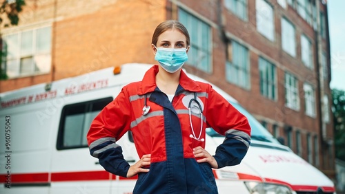 © VAKSMANV, Obraz premium One young beautiful woman paramedic standing outdoor wearing medical mask and looking at camera near ambulance vehicle. Emergency worker. Professional doctor or nurse at work. First aid assistance