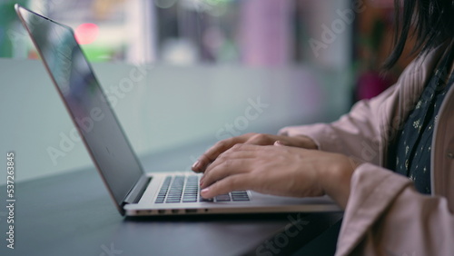 © Marco, Fototapeta premium One young hispanic woman opening laptop in coffee shop remote workplace. South American Brazilian girl using computer typing in keyboard