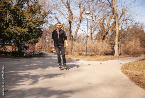 Fototapeta premium one young man, inline skating in a park outdoors.