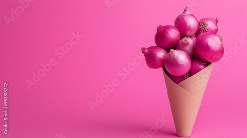 © Montalumirock, Fototapeta premium Onion for cooking spices on brown paper wrapping cone from grocery solid background
