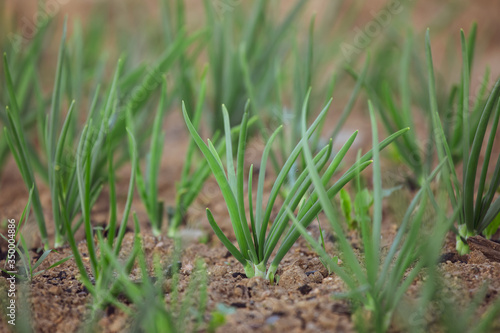 Fototapeta premium Onions sprout in early spring in the garden . young green onions