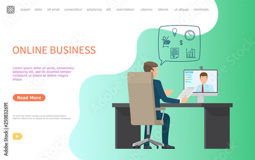 © robu_s, Fototapeta premium Online business web poster, person interviewing potential worker, asking about sales rate, growth of charts, money income and fresh ideas vector man at table